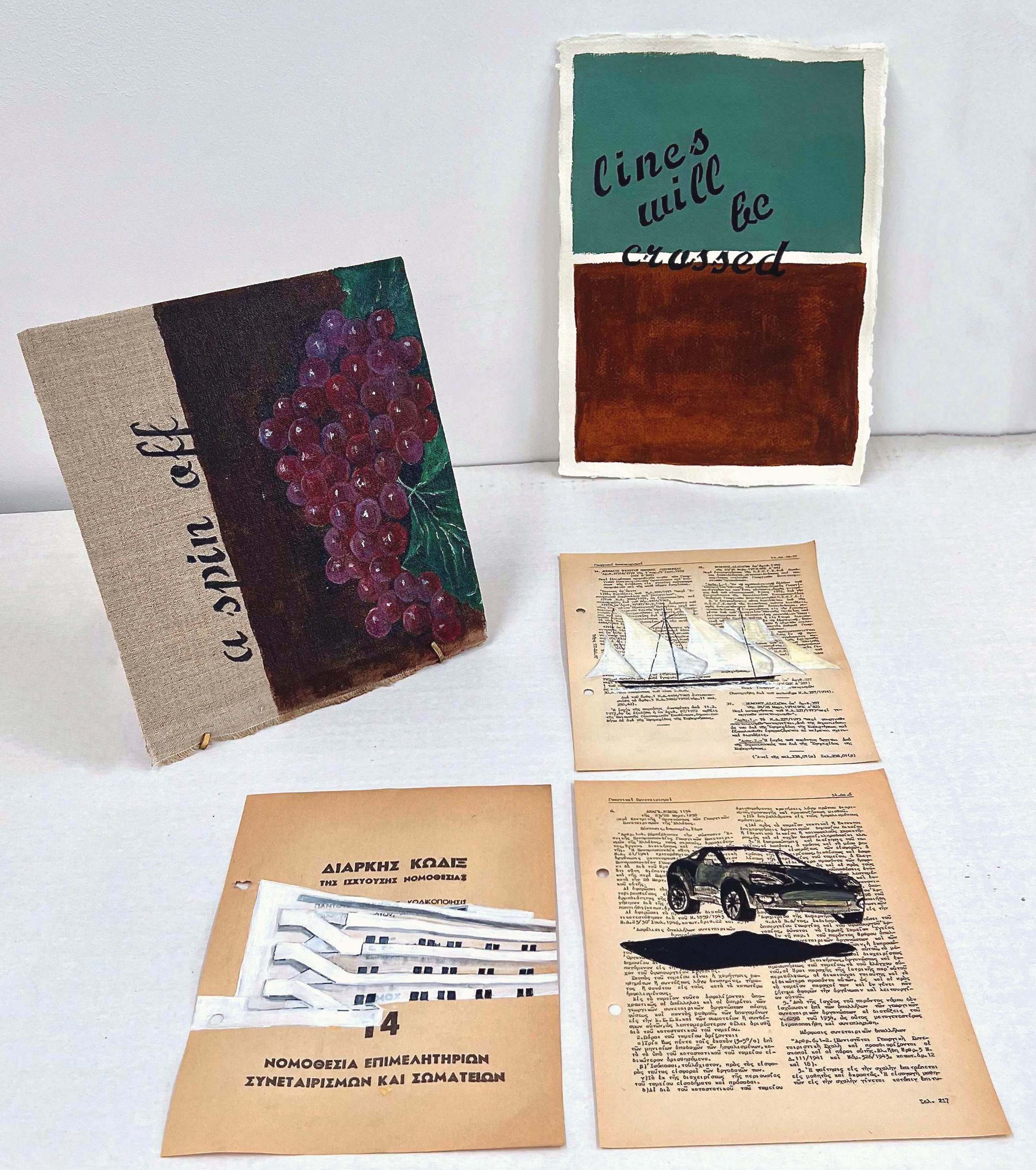 As in her previous works, the environment she creates is composed of different artistic means, each of which contributes to the rendering of an ambiguous, paradoxical setting, both visually and conceptually. The exterior and interior spaces alternate; there are paintings depicting grapes in an idyllic vineyard or a mysterious figure in the darkness, but also installations that form intimate spaces using old handmade papers with carefully selected phrases – familiar references or invented narratives open to interpretation.